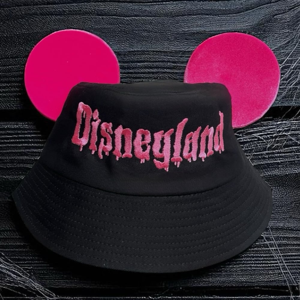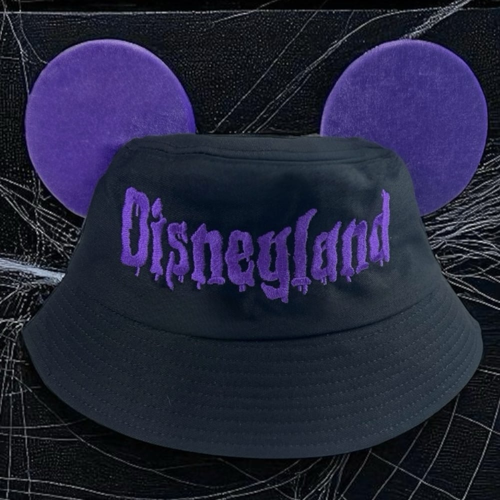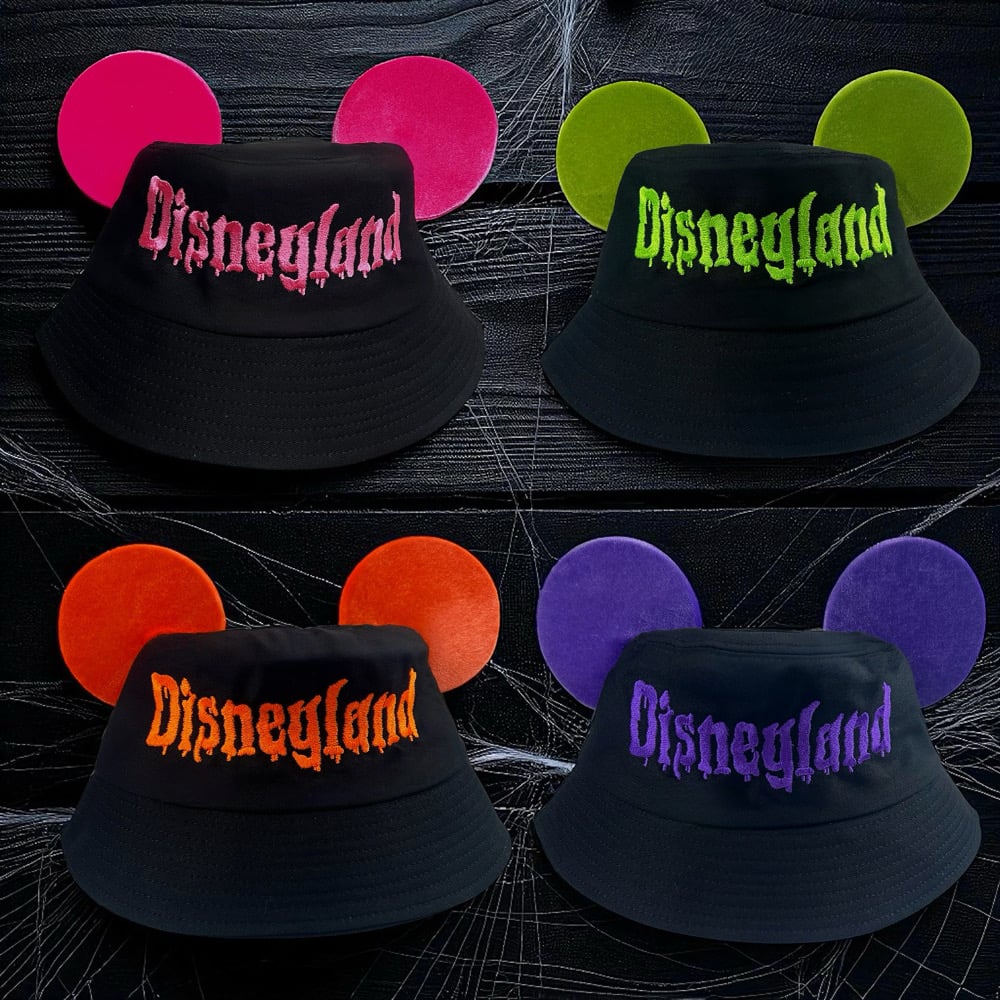 Black Bucket Hats With Velvet Mickey Ears And Embroidered “Disneyland” In A Goosebumps-Inspired Font. Choose From Pink, Green, Orange, Or Purple. Perfect For Halloween Park Days, Costume Parties, Or Year-Round Spooky Vibes.